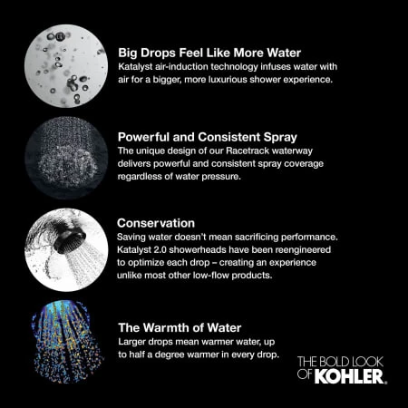 - Katalyst®: Air-induction technology delivers a sensational showering experience by infusing air into the water for bigger, warmer and voluptuous water droplets capable to embrace your body like an invigorating rainforest waterfall